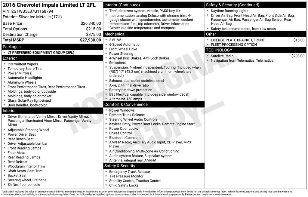 Powered by a 3.6L V6 engine and a smooth 6-speed automatic transmission, this Impala Limited delivers an impressive 18 city / 30 highway mpg. Enjoy the convenience of remote keyless entry, steering wheel-mounted audio controls, and a driver's 6-way power seat adjuster.